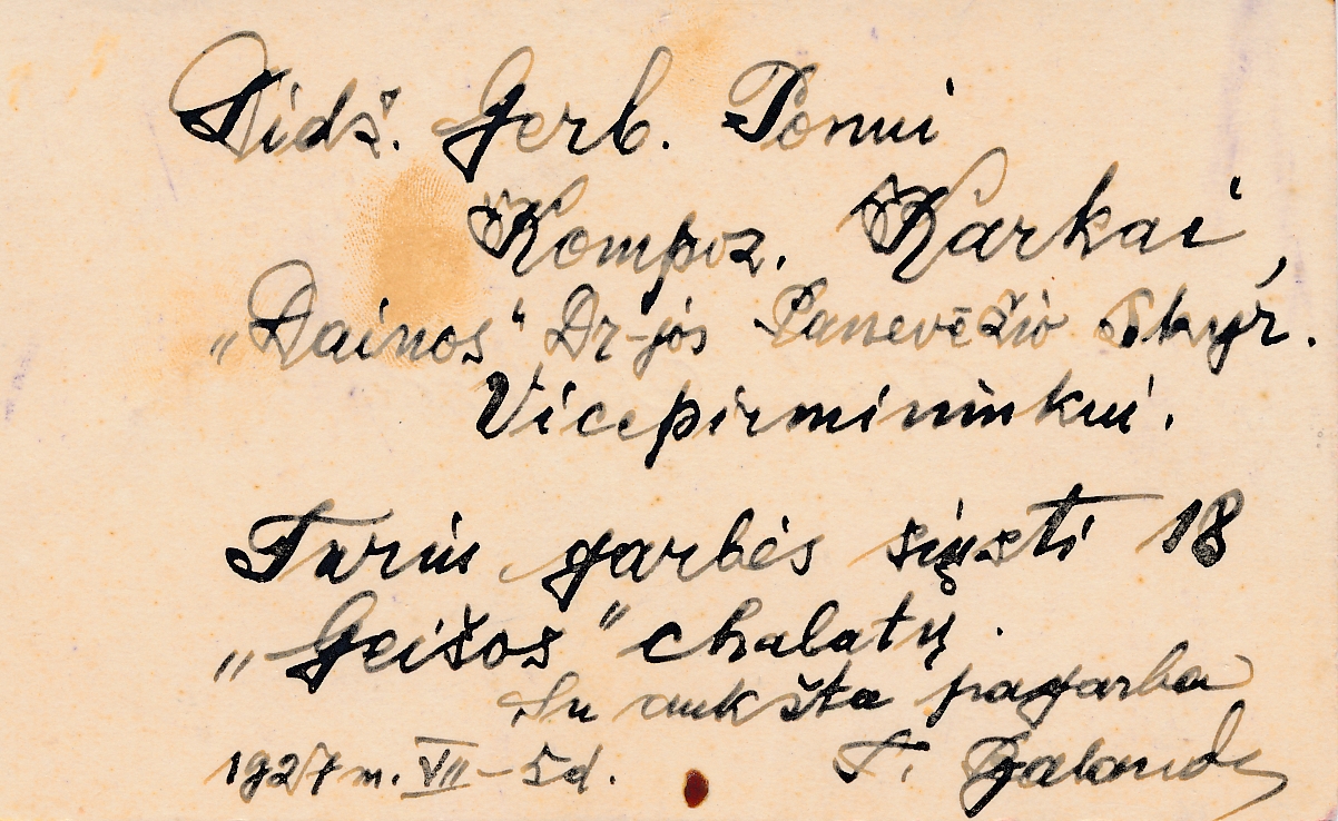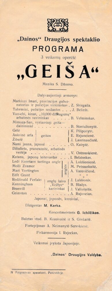 ![Daina (draugija). Panevėžio skyrius. Valdyba. Geiša : 3 veiksmų operetė : „Dainos“ draugijos spektaklio programa / muzika S. Džonso ; „Dainos“ draugijos valdyba ; dirigentas M. Karka ; koncertmeisteris G. Ichilčikas ; baletas stud. B. Koreivaitė, S. Ginkaitė ; fortepijonas A. Neimanytė-Servskienė ; fisharmonija I. Rajeckas. [Panevėžys : „Dainos“ draugijos valdyba], s.a. (Panevėžys : N. Feigenzono spaustuvė). PAVB, Mykolo Karkos fondas F12-86-3](https://paneveziokrastas.pavb.lt/wp-content/uploads/2025/10/15-F12-86-3-180x245.jpg)