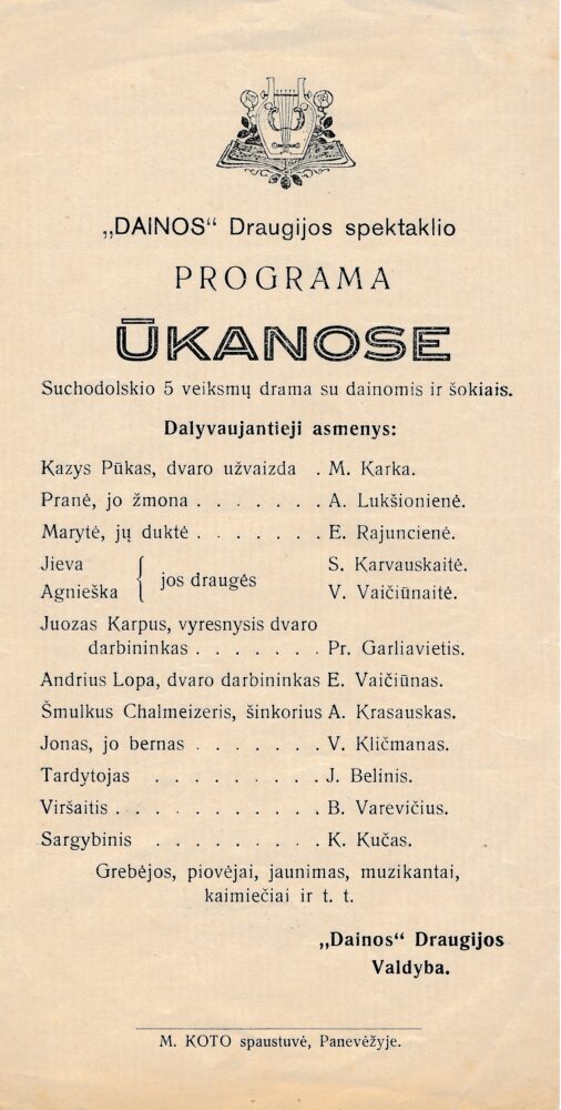 ![Daina (draugija). Panevėžio skyrius. Valdyba. Ūkanose : Suchodolskio 5 veiksmų drama su dainomis ir šokiais : „Dainos“ draugijos spektaklio programa / „Dainos“ draugijos valdyba. [Panevėžys : „Dainos“ draugijos valdyba], s.a. (Panevėžys : M. Koto spaustuvė). PAVB, Mykolo Karkos fondas F12-86-1](https://paneveziokrastas.pavb.lt/wp-content/uploads/2025/10/13-F12-86-1-180x245.jpg)