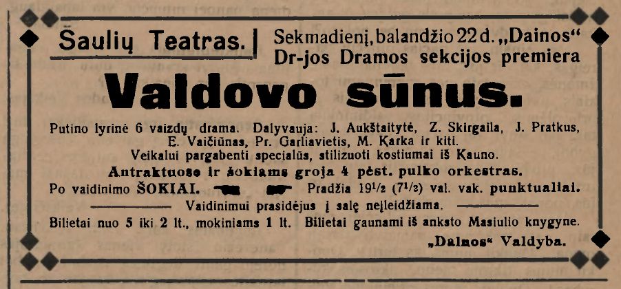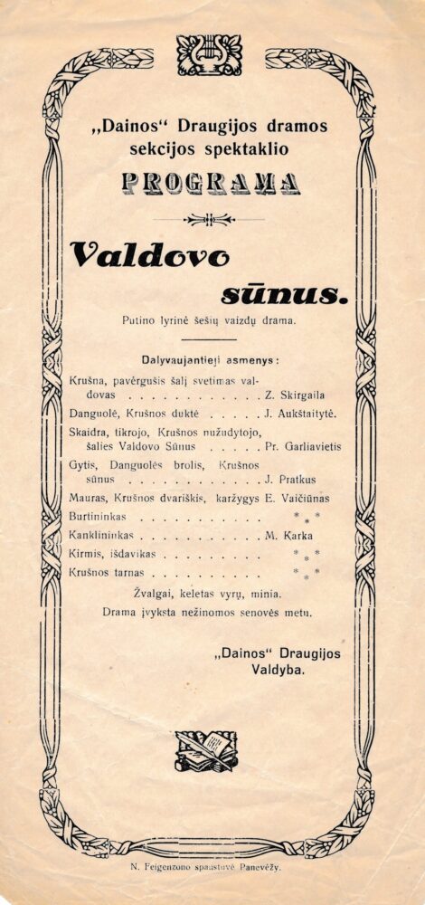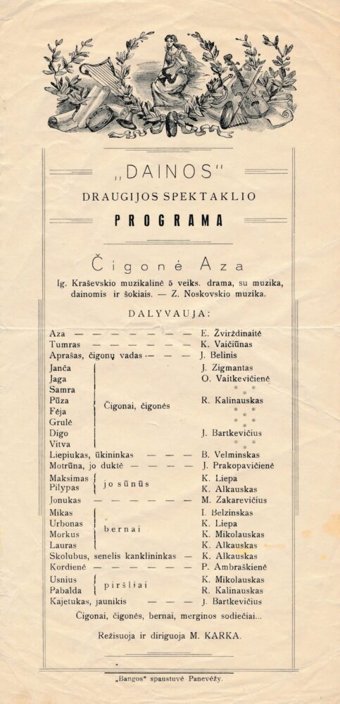 ![Daina (draugija). Panevėžio skyrius. Valdyba. Čigonė Aza : Ig. Kraševskio muzikalinė 5 veiks. drama su muzika, dainomis ir šokiais : „Dainos“ draugijos spektaklio programa / muzika Z. Noskovskio ; režisierius ir dirigentas M. Karka ; [„Dainos“ draugija. Panevėžio skyrius. Valdyba]. [Panevėžys : „Dainos“ draugija. Panevėžio skyrius. Valdyba], s.a. (Panevėžys : „Bangos“ spaustuvė). PAVB, Mykolo Karkos fondas F12-86-5](https://paneveziokrastas.pavb.lt/wp-content/uploads/2025/10/16-F12-86-5-180x245.jpg)