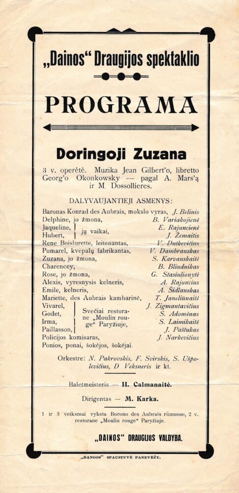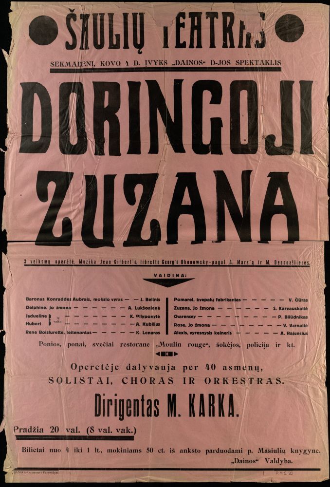 ![Doringoji Zuzana : 3 veiksmų operetė : [„Dainos“ draugijos Panevėžio skyriaus operetės „Doringoji Zuzana“ afiša] / muzika JeanGilbert'o ; librettoGeorg'o Okon[k]owsky ; pagal A. Mars'ą ir M. Dessoallieres ; dirigentas M. Karka ; „Dainos“ draugijos valdyba. [Panevėžys : „Dainos“ draugija. Valdyba, 1926?] (Panevėžys : „Bangos“ spaustuvė). PAVB, Mykolo Karkos fondas F12-87](https://paneveziokrastas.pavb.lt/wp-content/uploads/2025/10/Doringoji-Zuzana-180x245.jpg)