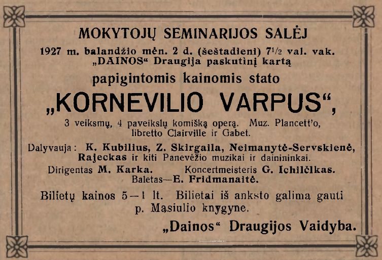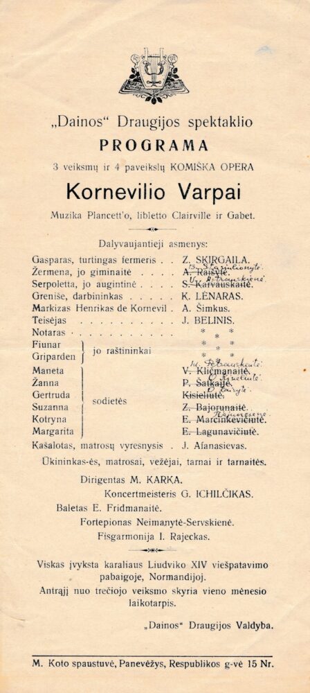 ![Daina (draugija). Panevėžio skyrius. Valdyba. Kornevilio varpai : 3 veiksmų ir 4 paveikslų komiška opera : „Dainos“ draugijos spektaklio programa / muzika Plancett'o ; librettoClairville ir Gabet ; dirigentas M. Karka ; koncertmeisteris G. Ichilčikas ; baletas E. Fridmanaitė ; fortepionas [A.] Neimanytė-Servskienė ; fisharmonija I. Rajeckas ; „Dainos“ draugijos [Panevėžio skyriaus] valdyba. [Panevėžys : „Dainos“ draugijos Panevėžio skyriaus valdyba], [1926?] (Panevėžys : M. Koto spaustuvė). PAVB, Mykolo Karkos fondas F12-86-7](https://paneveziokrastas.pavb.lt/wp-content/uploads/2025/10/18-F12-86-7-180x245.jpg)