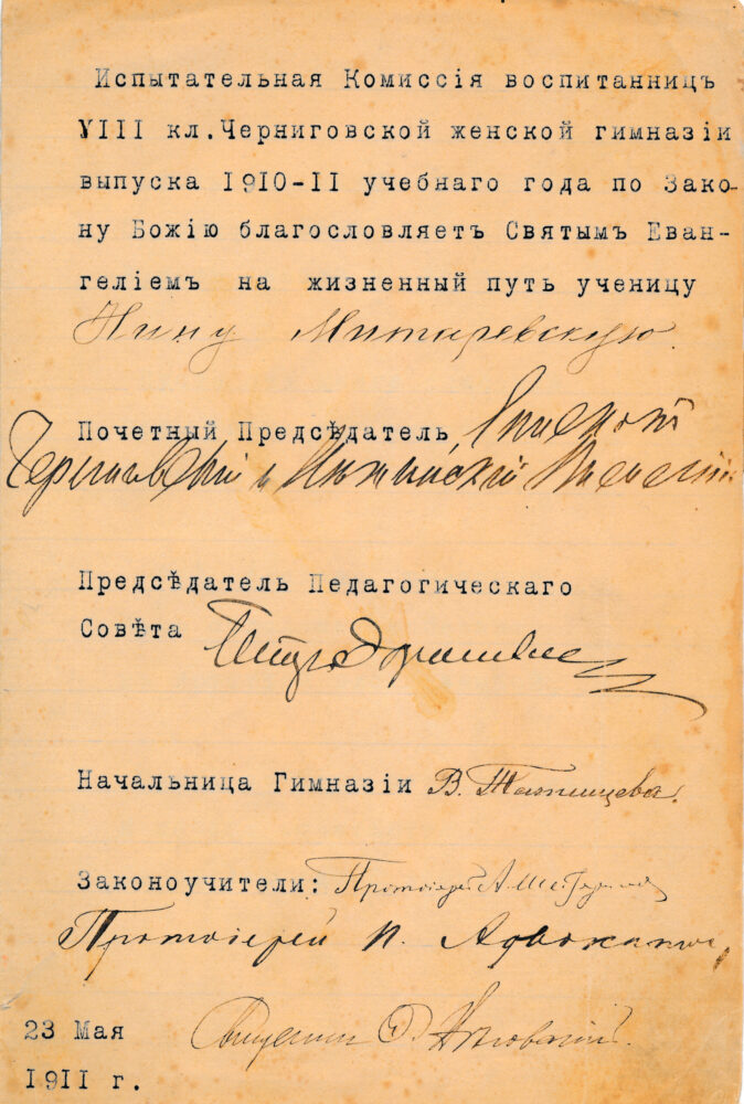 Господа нашего Исуса Христа Святое Евангелие от Матфея, Марка, Луки и Иоанна. 63-е изд. Санктпетербург, 1910. 464, 15 p. – Su Černigovo mergaičių gimnazijos mokytojų dedikacija Ninai Mitarevskajai (vėliau – Moigienė)