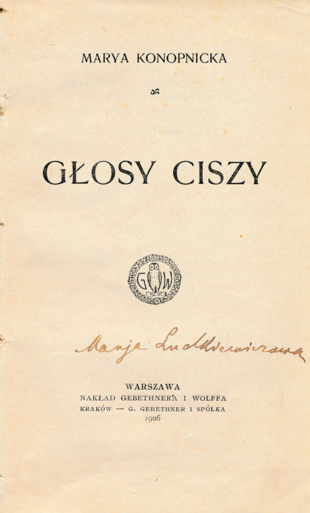Konopnicka, Maria. Głosy ciszy. Warszawa, 1906. 153 p. – Su įrašu: Marja Ludkiewiczowa