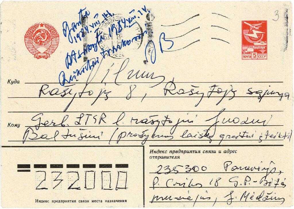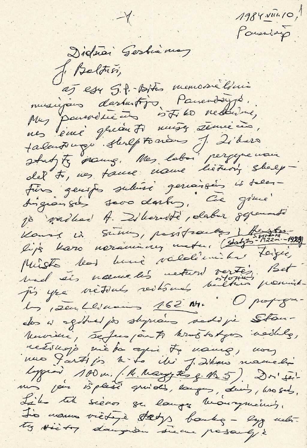 1. Juozo Mėdžiaus laiškas rašytojui Juozui Baltušiui. 1984 m. rugpjūčio 10 d. Lietuvos literatūros ir meno archyvas. F. 106, ap. 2, b. 608, l. 1