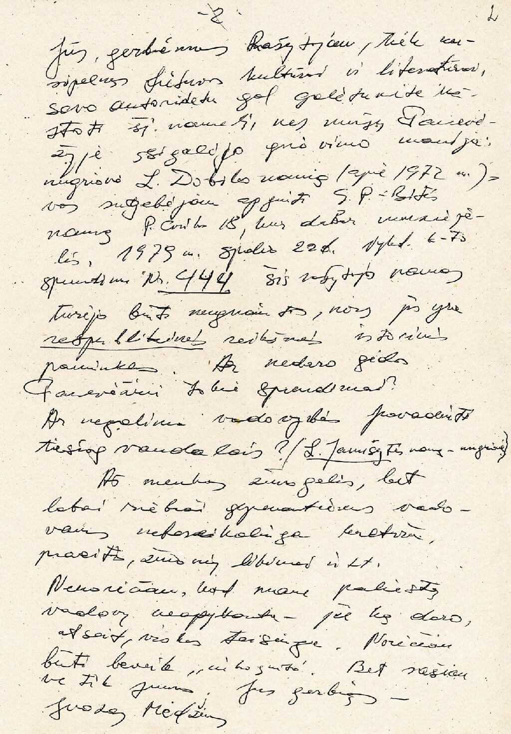 2. Juozo Mėdžiaus laiško rašytojui Juozui Baltušiui antras lapas. Lietuvos literatūros ir meno archyvas. F. 106, ap. 2, b. 608, l. 2