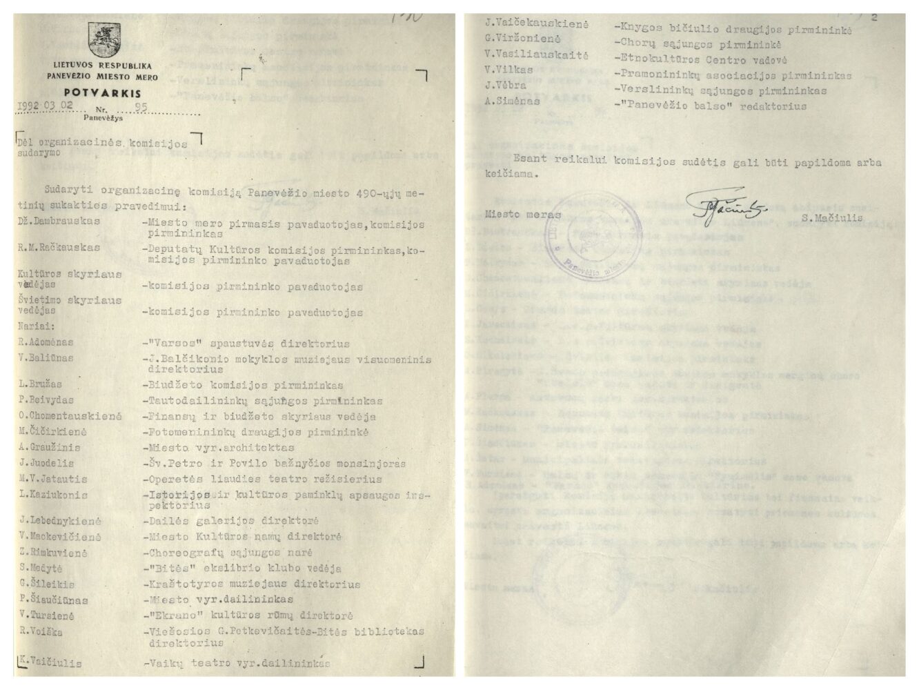 1. Panevėžio miesto mero potvarkis dėl Panevėžio 490 metų jubiliejaus organizacinės komisijos sudarymo. 1992 m. kovo 2 d. Šiaulių regioninio valstybės archyvo Panevėžio filialas. F. 1087, ap. 1, b. 329, l. 130, 131