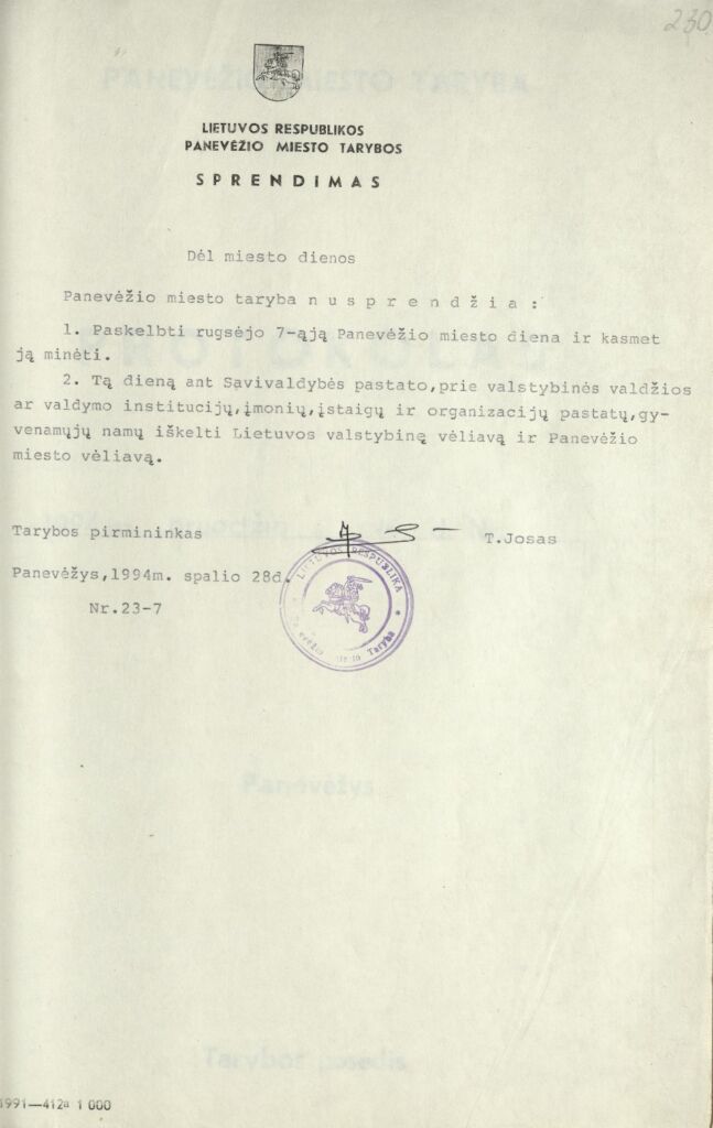 2. Panevėžio miesto tarybos sprendimas dėl rugsėjo 7-osios paskelbimo Panevėžio miesto diena. 1994 m. spalio 28 d.